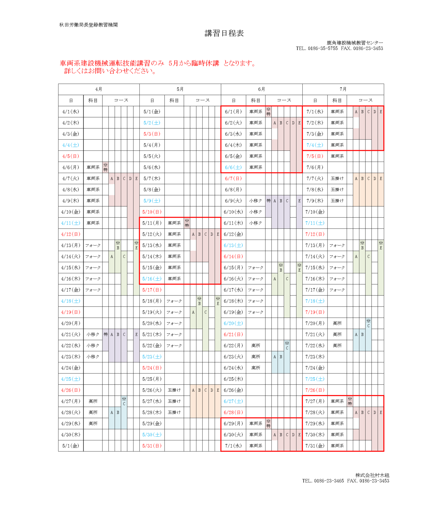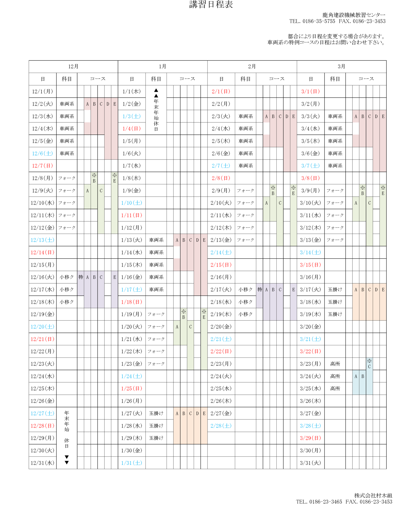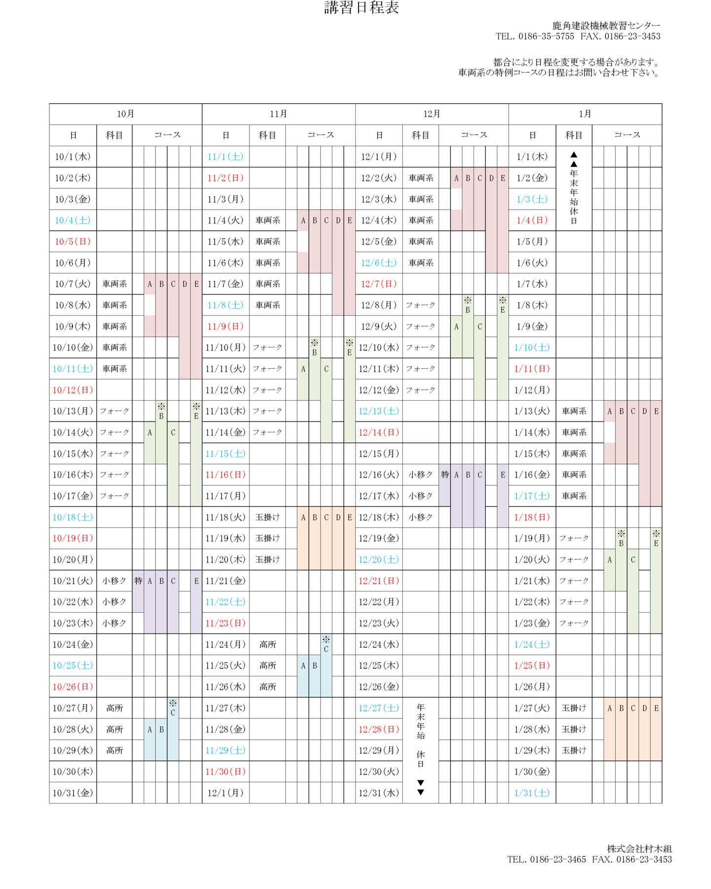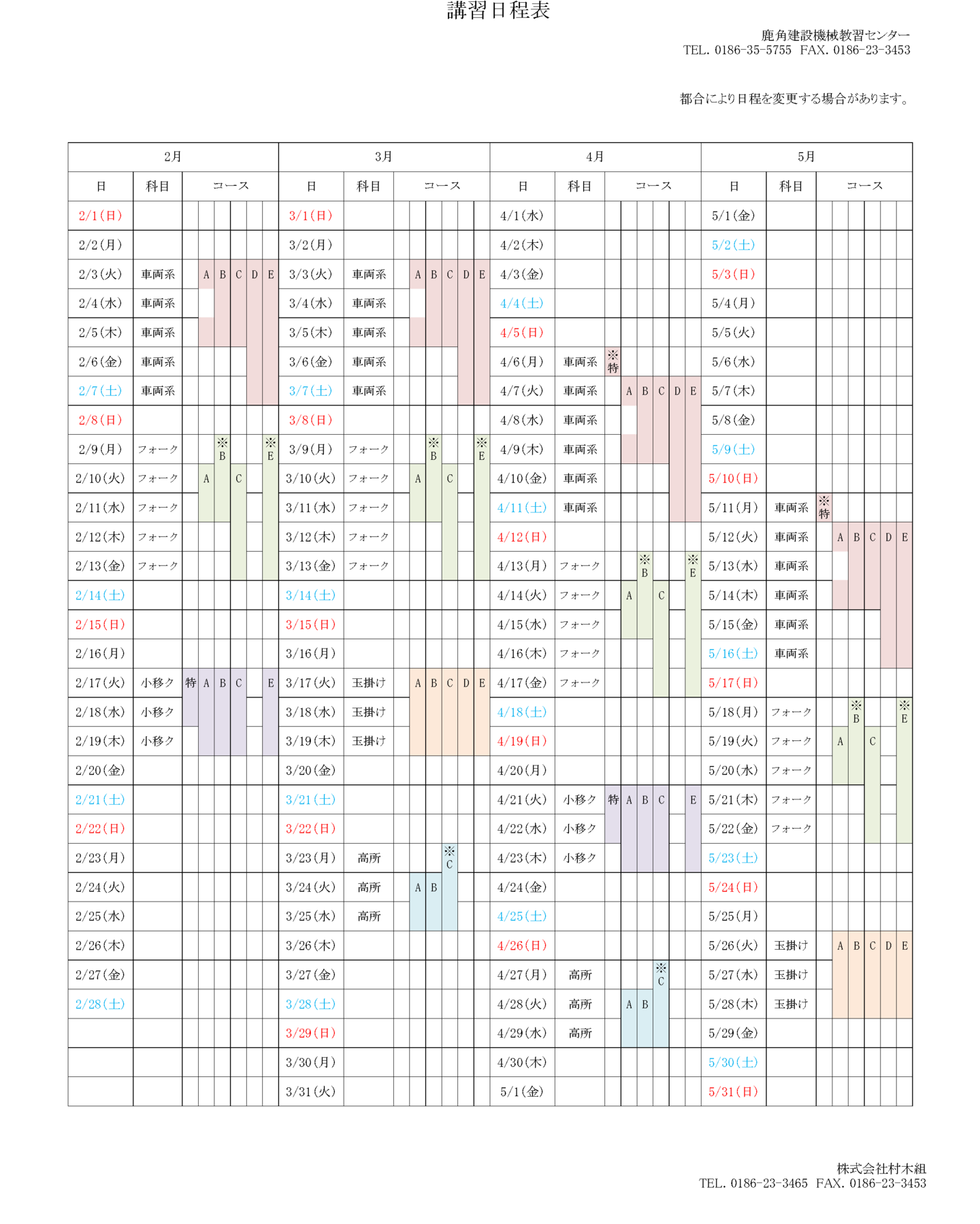 講習日程表 4か月間の日程予定表です(毎月月末に更新します) ※都合により日程を変更する場合があります。※車両系の特例コースの日程はお問い合わせください。 各コース、火曜日からの始まりとなります(一部コースを除く) 印刷用pdf ページトップへ 講習案内 講習日程 ダウンロード 会社概要 アクセス お知らせ お問い合わせ